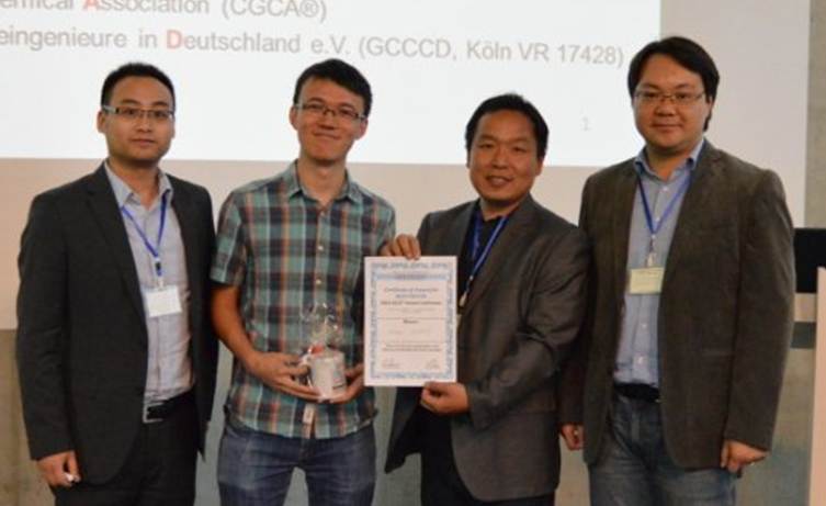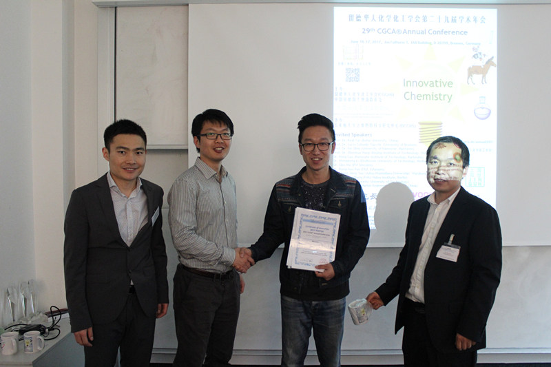 夏添(右二)和李蒙蒙博士(左二,颁奖人,荷兰埃因霍温工大)、理事长仝钰进博士(左一)、组委会主席魏刚博士(右一)合影 2016年留德华人化学化工学会墙报奖得主