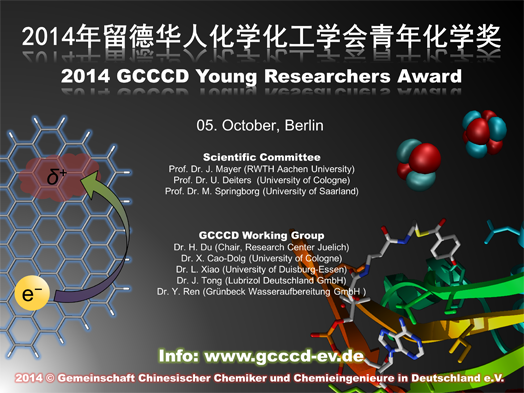2015年留德华人化学化工学会青年化学奖申请开始 为奖励优秀留学人员在学习和科研上取得的优异成绩,留德华人化学化工学会从2014年起设立 “留德华人化学化工学会青年化学奖”。2015年度的奖项申报活动已经开始,今年我们更是邀请到了2014年德国莱布尼兹奖 (Gottfried Wilhelm Leibniz Prize)得主,杜伊斯堡-埃森大学 Christof Schulz教授加入2015年留德华人化学化工学会青年化学奖专家评审组。2015年度青年化学奖的申报时间至5月31日截止,最终评审结果将于2015年8月29日在学会年会上揭晓,学会为获奖人颁发留德华人化学化工学会青年化学奖证书和一定数额奖金。有关申报条件、所需申报材料及评选办法等事宜请参阅附件“Guidelines for the GCCCD Young Researchers Award”。欢迎大家积极申报! 有意申报者请将申报材料以电子邮件形式发送给 请申请者将简历和推荐信发送至任衍泽博士: yanze.ren@gcccd-ev.de 以及张正龙博士:zhenglong.zhang@gcccd-ev.de 如果您寄出申请一周后仍然没有收到我们的确认邮件,请联系科隆大学理论化学所曹晓燕博士,联系电话: 0221-4707893,电邮地址: x.cao@uni-koeln.de 专家评审团: Prof. Dr. C. Schulz (Universität Duisburg-Essen), Prof. Dr. M. Dolg (Universität zu Köln), Prof. Dr. T. Heinze (Friedrich-Schiller-Universität Jena).