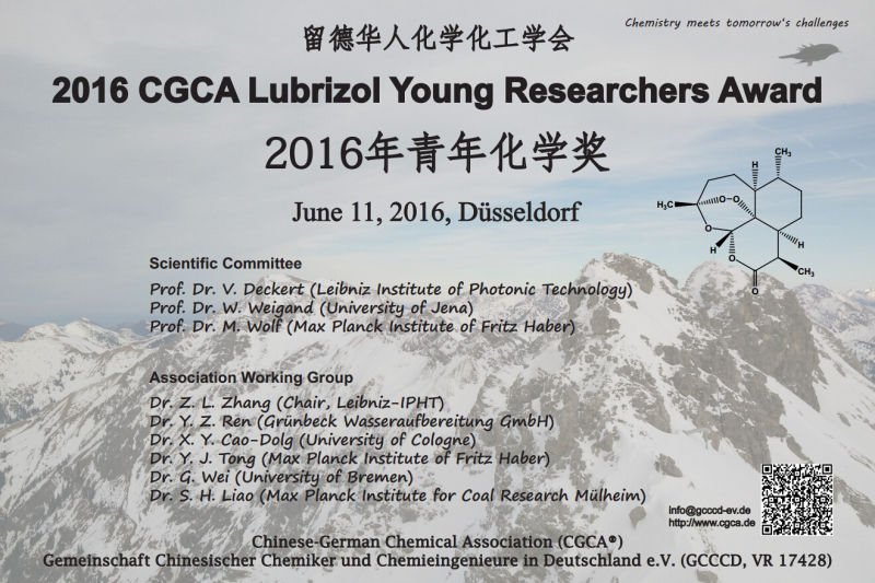 2016年留德华人化学化工学会路博润青年化学奖申请开始 为奖励优秀留学人员在学习和科研上取得的优异成绩,留德华人化学化工学会从2014年起设立 “留德华人化学化工学会青年化学奖”。感谢路博润特种化学品公司的支持,今年的化学奖奖项名称为“留德华人化学化工学会路博润青年化学奖”。值得我们骄傲的是,谭庚文和张琦在分别获得我会2014年度以及2015年度青年化学奖之后,又获得了国家优秀自费留学生奖。 2014年青年奖化学奖获得者张正龙获得莱比尼兹光子技术学院2016年特别贡献奖。2015年获奖者涂敏又申请到欧盟玛丽居里奖学金(Marie Skłodowska-Curie actions-Individual Fellowship), 已前往比利时鲁汶大学继续科学研究。2016年度的奖项申报的截止日期为4月25日, 最终评审结果将于2016年6月11日杜塞尔多夫年会上揭晓,学会为获奖人颁发留德华人化学化工学会青年化学奖证书和一定数额奖金。有关申报条件、所需申报材料及评选办法等事宜请参阅下面的附件。欢迎大家积极申报!有意申报者请将申报材料以电子邮件的形式发送给张正龙博士: zhenglong.zhang@gcccd-ev.de 如果您寄出申请一周后仍然没有收到我们的确认邮件,请联系科隆大学理论化学所曹晓燕博士,联系电话: 0221-4707893,电邮地址: x.cao@uni-koeln.de 专家评审团: Prof. Dr. W. Weigand (Friedrich-Schiller-University Jena) , Prof. Dr. V. Deckert (Leibniz Institute of Photonic Technology), Prof. Dr. M. Wolf (Fritz-Haber-Institut der Max-Planck-Gesellschaft) | |||||||