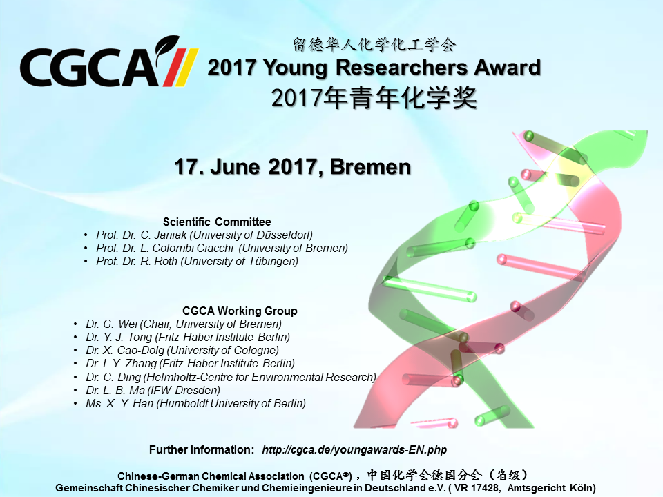 2017年留德华人化学化工学会青年化学奖申请开始 为奖励优秀留学人员在学习和科研上取得的优异成绩,留德华人化学化工学会从2014年起设立“留德华人化学化工学会青年化学奖”。值得我们骄傲的是, 谭庚文先生、张琦先生、李蒙蒙先生在分别获得我会2014、 2015、2016年度青年化学奖之后,又分别获得了2014、 2015、2016年的国家优秀自费留学生奖(中国国家留学基金委)。 2014年度青年化学奖获得者张正龙博士已于2016年赴陕西师范大学任教授职务。2017年度的奖项申报的截止日期为5月7日, 最终评审结果将于2017年6月17日不莱梅年会上揭晓,学会为获奖人颁发留德华人化学化工学会青年化学奖证书和一定数额奖金。有关申报条件、所需申报材料及评选办法等事宜请参阅下面的附件。欢迎大家积极申报! 有意申报者请将申报材料以电子邮件的形式发送请于5月7日前将申请资料(包括CV和推荐信)以电子邮件方式发至: 魏刚 博士 (wei_gang@cgca.de) 并抄送给仝钰进 博士 (tong_yujin@cgca.de)。如果您寄出申请一周后仍然没有收到我们的确认邮件,请联系仝钰进博士(tong_yujin@cgca.de)或致电学会办公室(0221-4707893) 专家评审团: Prof. Dr. Christoph Janiak (University of Düsseldorf), Prof. Dr. Lucio Colombi Ciacchi (University of Bremen), Prof. Dr. Roland Roth (University of Tübingen)