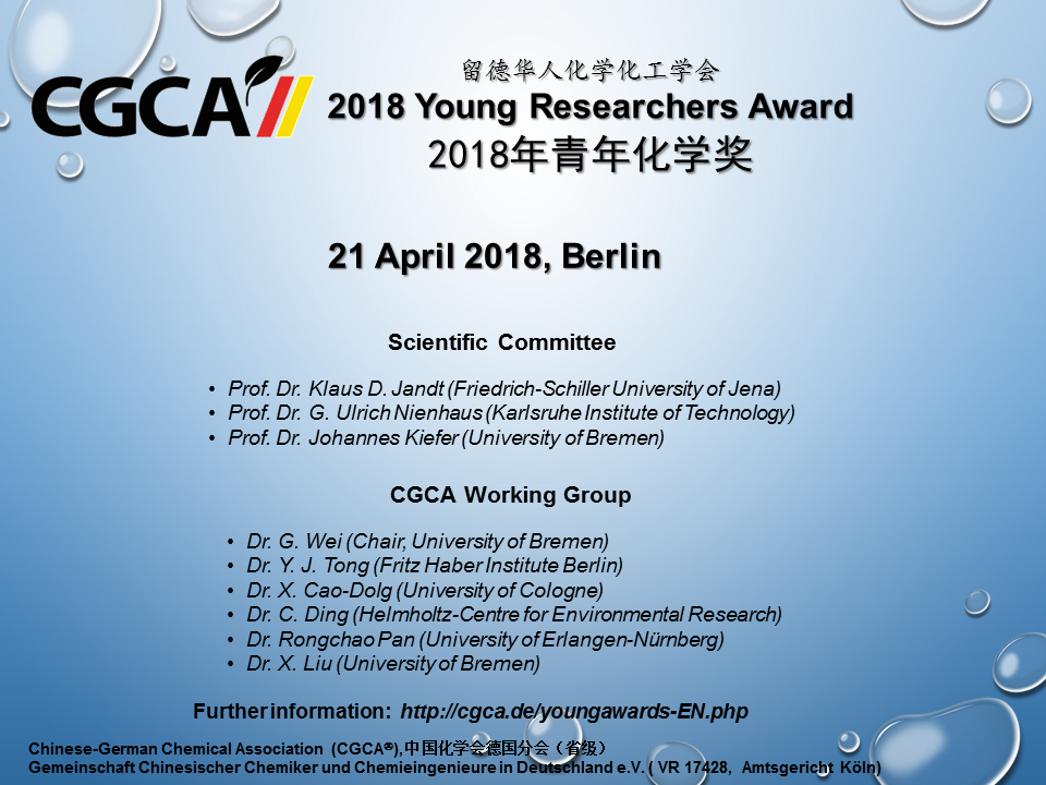 2018年留德华人化学化工学会青年化学奖申请开始 为奖励优秀留学人员在学习和科研上取得的优异成绩,留德华人化学化工学会从2014年起设立“留德华人化学化工学会青年化学奖”。值得我们骄傲的是, 谭庚文先生、张琦先生、李蒙蒙、蔡彬先生在分别获得我会2014、 2015、2016年度青年化学奖之后,又分别获得了2014、 2015、2016、2017年的国家优秀自费留学生奖(中国国家留学基金委)。 2014年度青年化学奖获得者张正龙博士已于2016年赴陕西师范大学任教授职务。2018年度的奖项申报的截止日期为3月15日, 最终评审结果将于2018年4月21日柏林年会上揭晓,学会为获奖人颁发留德华人化学化工学会青年化学奖证书和一定数额奖金。有关申报条件、所需申报材料及评选办法等事宜请参阅下面的附件。欢迎大家积极申报! 有意申报者请将申报材料以电子邮件的形式发送请于3月15日前将申请资料(包括CV和推荐信)以电子邮件方式发至: 魏刚 博士 (wei_gang@cgca.de) 并抄送给仝钰进 博士 (tong_yujin@cgca.de)。如果您寄出申请一周后仍然没有收到我们的确认邮件,请联系仝钰进博士(tyjhit@gmail.com) 或致电学会办公室(0221-4707893) 专家评审团: Prof. Dr. Klaus D. Jandt (Friedrich-Schiller University of Jena), Prof. Dr. G. Ulrich Nienhaus (Karlsruhe Institute of Technology), Prof. Dr. Johannes Kiefer (University of Bremen)