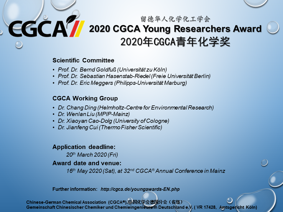 2020年留德华人化学化工学会青年化学奖申请开始! 为奖励优秀留学人员在学习和科研上取得的优异成绩,留德华人化学化工学会从2014年起设立“留德华人化学化工学会青年化学奖”。值得我们骄傲的是, 谭庚文、张琦、李蒙蒙、蔡彬,周宇鹏,李爽等同学在获得我会青年化学奖之后,又获得了国家优秀自费留学生奖(中国国家留学基金委)。 另外,2014年度青年化学奖获得者张正龙博士已于2016年赴陕西师范大学任教授职务,2016年度获奖者李蒙蒙博士于入选2019国家青年 千人项目。2020年度的奖项申报的截止日期为3月20日,最终评审结果将于2020年5月16日美因茨年会上揭晓,学会为获奖人颁发留德华人化学化工学会青年化学奖证书,和一定数额奖金。 有关申报条件、所需申报材料及评选办法等事宜请参阅下面的附件。欢迎大家积极申报! 有意申报者请将申报材料以电子邮件的形式发送请于3月20日前将申请资料(包括CV和推荐信)以电子邮件方式发至: 丁昶 博士 (chang.ding(at)ufz.de) 并抄送给曹晓燕 博士 (x.cao(at)uni-koeln.de)。如果您寄出申请一周后仍然没有收到我们的确认邮件, 请联系刘文斓博士 ( liuwenlan(at)mpip-mainz.mpg.de )或致电学会办公室(0221-4707893) 专家评审团: Prof. Dr. Bernd Goldfuss (Universitaet zu Koeln), Prof. Dr. Sebastian Hasenstab-Riedel (Freie Universitaet Berlin), Prof. Dr. Eric Meggers (Philipps-Universitaet Marburg)