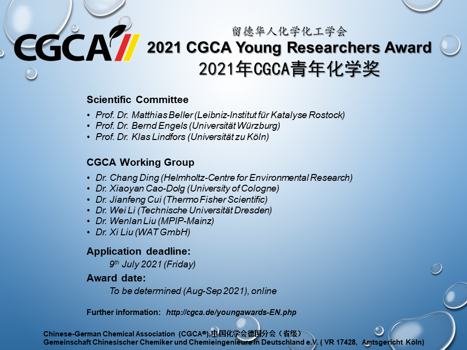 2021年留德华人化学化工学会青年化学奖申请开始! 为奖励优秀留学人员在学习和科研上取得的优异成绩,留德华人化学化工学会从2014年起设立"留德华人化学化工学会青年化学奖"。值得我们骄傲的是, 谭庚文、张琦、李蒙蒙、蔡彬,周宇鹏,李爽,盛文波等在获得我会青年化学奖的同时,又获得了国家优秀自费留学生奖(中国国家留学基金委)。 另外,张正龙博士现任陕西师范大学任教授职务,张鋆博士现在深圳湾实验室任高级工程师,谭庚文博士现任苏州大学材料与化学化工学部教授,李蒙蒙博士现任北京中科院微电子研究所研究员。2021年度的奖项申报的截止日期为7月9日,入围前三名的获奖人结果将于2021年9月间公布,稍后会通过学术报告会的形式正式揭晓前三名的最终排序,学会为获奖人颁发留德华人化学化工学会青年化学奖证书,和一定数额奖金。有关申报条件、所需申报材料及评选办法等事宜请参阅下面的附件。欢迎大家积极申报。有意申报者请将申报材料以电子邮件的形式发送请于7月9日前将申请资料(包括CV和推荐信)以电子邮件方式发至: 丁昶 博士 (chang.ding(at)ufz.de) 并抄送给曹晓燕 博士 (x.cao(at)uni-koeln.de)。如果您寄出申请一周后仍然没有收到我们的确认邮件, 请联系刘文斓博士 ( liuwenlan(at)mpip-mainz.mpg.de ) ( liuwenlan(at)mpip-mainz.mpg.de ) 专家评审团: Prof. Dr. Matthias Beller (Leibniz-Institut für Katalyse Rostock), Prof. Dr. Bernd Engels (Universität Würzburg), Prof. Dr. Bernd Engels (Universität Würzburg), Prof. Dr. Klas Lindfors (Universität zu Köln)