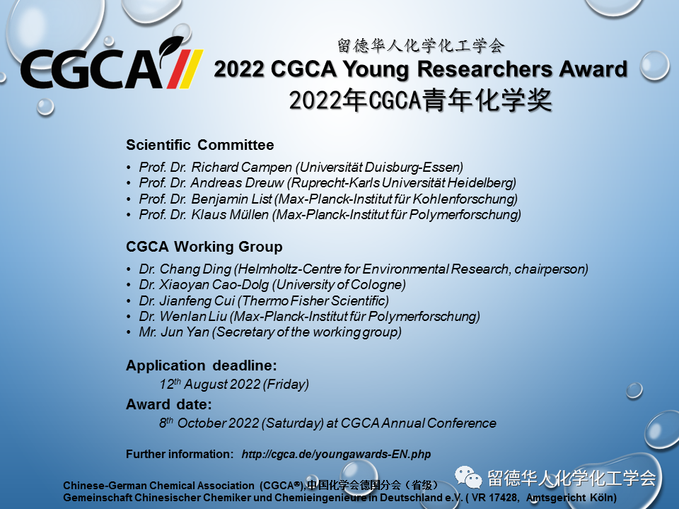 2022年留德华人化学化工学会青年化学奖申请开始! 2021年诺贝尔化学奖获得者Benjamin List教授应邀担任评委! 为奖励优秀留学人员在学习和科研上取得的优异成绩,留德华人化学化工学会从2014年起设立"留德华人化学化工学会青年化学奖"。值得我们骄傲的是,谭庚文、张琦、李蒙蒙、蔡彬、刘陆平、张志阳、周宇鹏、李爽、盛文波等在获得我会青年化学奖的同时,又分别获得了国家优秀自费留学生奖(中国国家留学基金委)。此外,张正龙博士现任陕西师范大学教授、张鋆博士任深圳湾实验室高级工程师、谭庚文博士现任苏州大学材料与化学化工学部教授、李蒙蒙博士现任北京中科院微电子研究所研究员、刘劼博士现任湖南大学教授、张志阳博士任中科院烟台海岸带研究所研究员、刘陆平博士任中国医学科学院北京协和医学院药物研究所研究员、盛文波博士任中国科学院兰州化学物理研究所特聘青年研究员等等。2022年度的奖项申报的截止日期为8月12日,入围前三名的获奖人结果将于2022年9月间公布,稍后会通过学术报告会的形式正式揭晓前三名的最终排序,学会为获奖人颁发留德华人化学化工学会青年化学奖证书,和一定数额奖金。有关申报条件、所需申报材料及评选办法等事宜请参阅下面的附件。欢迎大家积极申报。有意申报者请将申报材料以电子邮件的形式发送请于8月12日前将申请资料(包括CV和推荐信)以电子邮件方式发至: 丁昶 博士 (chang.ding(at)ufz.de) 并抄送给曹晓燕 博士 (x.cao(at)uni-koeln.de)。如果您寄出申请一周后仍然没有收到我们的确认邮件, 请联系刘文斓博士 ( liuwenlan(at)mpip-mainz.mpg.de ) ( liuwenlan(at)mpip-mainz.mpg.de ) 专家评审团: Prof. Dr. Richard Campen (Universität Duisburg-Essen), Prof. Dr. Andreas Dreuw (Ruprecht-Karls Universität Heidelberg), Prof. Dr. Benjamin List (Max-Planck-Institut für Kohlenforschung), Prof. Dr. Klaus Müllen (Max-Planck-Institut für Polymerforschung)