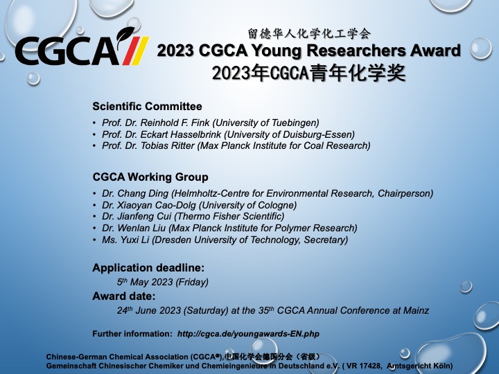 2023年留德华人化学化工学会青年化学奖申请开始! 为奖励优秀留学人员在学习和科研上取得的优异成绩,留德华人化学化工学会从2014年起设立"留德华人化学化工学会青年化学奖"。值得我们骄傲的是,谭庚文、张琦、李蒙蒙、蔡彬、刘陆平、张志阳、周宇鹏、李爽、盛文波等在获得我会青年化学奖的同时,又分别获得了国家优秀自费留学生奖(中国国家留学基金委)。此外,张正龙博士现任陕西师范大学教授、张鋆博士任深圳湾实验室高级工程师、谭庚文博士现任苏州大学材料与化学化工学部教授、李蒙蒙博士现任北京中科院微电子研究所研究员、刘劼博士现任湖南大学教授、张志阳博士任中科院烟台海岸带研究所研究员、刘陆平博士任中国医学科学院北京协和医学院药物研究所研究员、盛文波博士任中国科学院兰州化学物理研究所特聘青年研究员等等。2023年度的奖项申报的截止日期为5月5日,入围前三名的获奖人结果将于2023年6月24日公布,稍后会通过学术报告会的形式正式揭晓前三名的最终排序,学会为获奖人颁发留德华人化学化工学会青年化学奖证书,和一定数额奖金。有关申报条件、所需申报材料及评选办法等事宜请参阅下面的附件。欢迎大家积极申报。有意申报者请将申报材料以电子邮件的形式发送请于5月5日前将申请资料(包括CV和推荐信)以电子邮件方式发至: 丁昶 博士 (chang.ding(at)ufz.de) 并抄送给曹晓燕 博士 (x.cao(at)uni-koeln.de)。如果您寄出申请一周后仍然没有收到我们的确认邮件, 请联系刘文斓博士 ( liuwenlan(at)mpip-mainz.mpg.de ) ( liuwenlan(at)mpip-mainz.mpg.de ) 专家评审团: Prof. Dr. Reinhold F. Fink (University of Tuebingen), Prof. Dr. Eckart Hasselbrink (University of Duisburg-Essen), Prof. Dr. Tobias Ritter (Max Planck Institute for Coal Research)