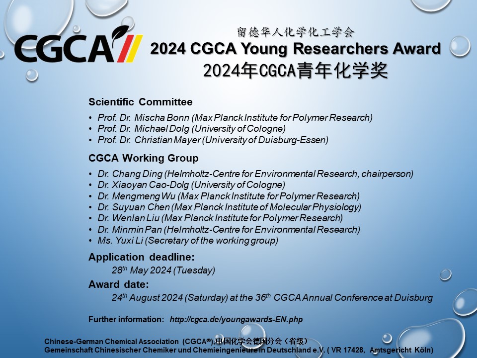 2025年留德华人化学化工学会青年化学奖申请开始! 各位尊敬的化学、化工同仁,您好! 我们诚邀您参加2025年留德华人化学化工学会青年化学奖评选! 留德华人化学化工学会是一个由在德国工作学习的华人学者、学生组织成立的非营利性学术组织,是中国化学会的德国分会,已经有三十多年的历史。留德华人化学化工学会青年化学奖设立于2014年,以奖励优秀留学人员在学习和科研上取得的优异成绩。评审专家由来自德国高校的教授组成。迄今为止,已有三十多位优秀青年科学家获得青年化学奖。 令我们倍感骄傲的是,多位化学奖获奖者已经获得学术界的认可,张正龙博士(2014年)现任陕西师范大学教授、张鋆博士(2014年)任深圳湾实验室高级工程师、谭庚文博士(2014年)现任中山大学化学学院教授、张琦博士(2015年)现任四川大学化学化工大学教授、蔡彬博士(2016年)现任山东大学教授、李蒙蒙博士(2016年)现任北京中科院微电子研究所研究员、刘劼博士(2016年)现任湖南大学教授、刘陆平博士(2017年)任北京协和药物研究所研究员、何欣博士(2017年)任四川大学化学工程学院教授、张志阳博士(2018年)任中科院烟台海岸带研究所研究员、周宇鹏博士(2018年)中国科学院上海药物研究所研究员、马佳佳博士(2019年)任上海交通大学变革性分子前沿科学中心长聘教轨副教授、王玉文博士(2019年)任国科大杭州高等研究院特聘研究员、杨寄博士(2020年)任上海交大副教授、盛文波博士(2020年)任中国科学院兰州化学物理研究所特聘青年研究员、陈广波博士(2020年)任中国科学院理化技术研究所研究员、陈朝见博士(2021年)任南京大学副教授、冯华阳博士(2023年)任河南省人民医院担任助理研究员等等。学会为各位青年化学奖获奖者在各自领域取得的非凡职业成就深感自豪! 目前,本年度留德华人化学化工学会青年化学奖申报活动已经正式开始,最终入围前三名的获奖人结果,将于2025年7月正式公布。之后,三位获奖人将在学会第37届年会期间(2025年8月22-23日)作学术报告并角逐青年化学奖一等奖的归属。学会将为获奖人颁发获奖证书以及一定数额的奖金。 留德华人化学化工学会青年化学奖参评条件为:留德在读博士生,或毕业(按答辩日期算)未满一年的博士。详情请访问文末申请须知以及CV模板。 您若有意申请青年化学奖,请于5月16日(周五)前将申请资料(包括CV和推荐信)以电子邮件方式发至:丁昶 博士 (chang.ding@ufz.de) 并抄送给 曹晓燕 博士 (x.cao@uni-koeln.de)。如果您寄出申请一周后仍然没有收到我们的确认邮件,请联系刘文斓博士 (liuwenlan@mpip-mainz.mpg.de). 留德华人化学化工学会青年化学奖期待您的参与! 2025年留德华人化学化工学会青年化学奖评奖委员会 专家评审团: Prof. Dr. Jens O. Krömer (Martin-Luther-University Halle-Wittenberg), Prof. Dr. Patrik Schmuki (University of Erlangen-Nuremberg), Prof. Dr. Bernd Strehmel (Hochschule Niederrhein)