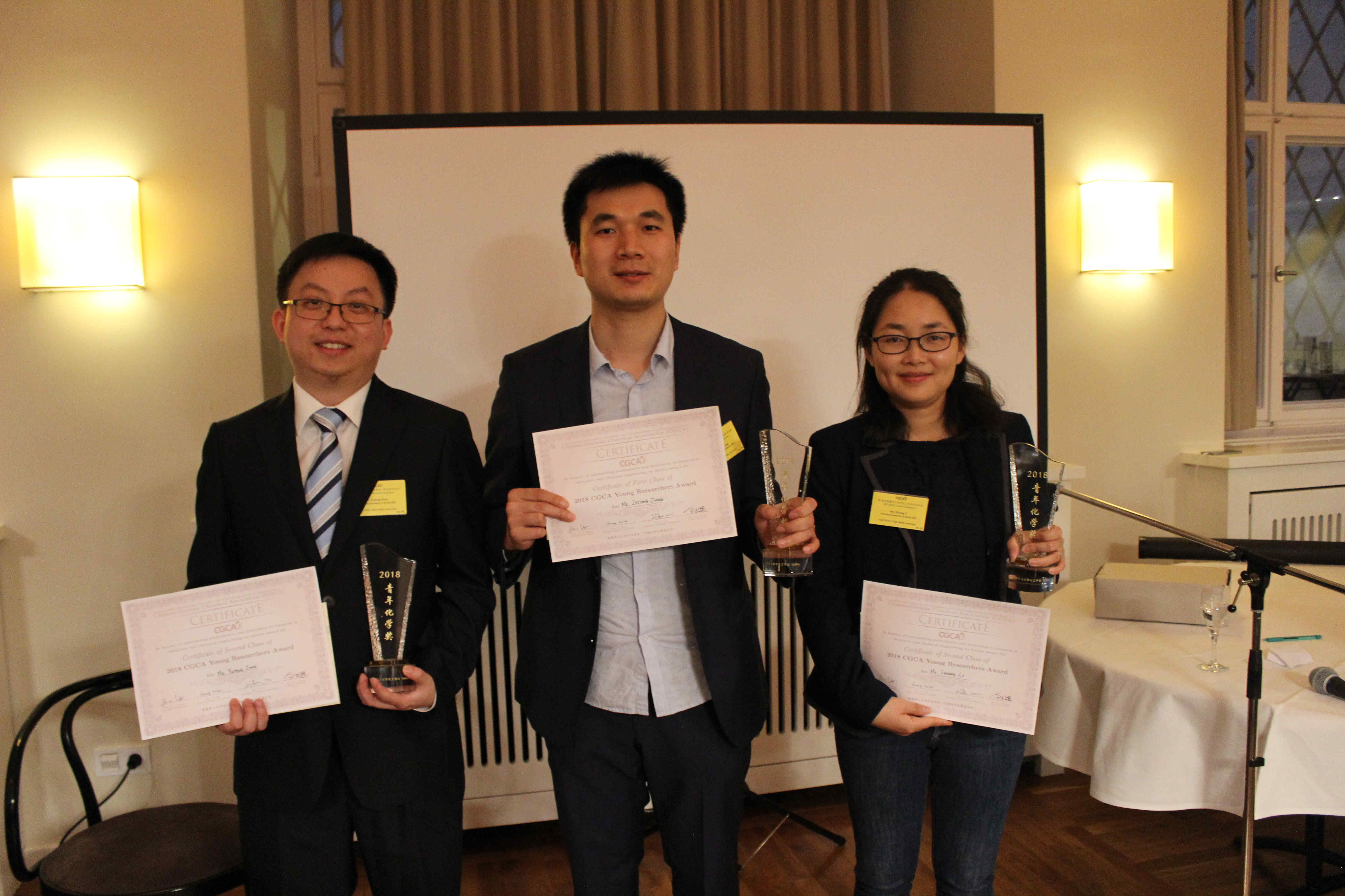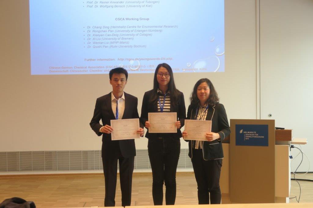 从左到右;刘劼,李蒙蒙,蔡彬 专家评审团: Prof. Dr. W. Weigand (Friedrich-Schiller-University Jena) , Prof. Dr. V. Deckert (Leibniz Institute of Photonic Technology), Prof. Dr. M. Wolf (Fritz-Haber-Institut der Max-Planck-Gesellschaft) | |||||||