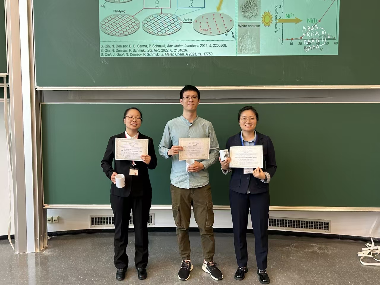 从左到右;涂敏,张琦,苏蒙 专家评审团: Prof. Dr. C. Schulz (Universität Duisburg-Essen), Prof. Dr. M. Dolg (Universität zu Köln), Prof. Dr. T. Heinze (Friedrich-Schiller-Universität Jena). | |||||||